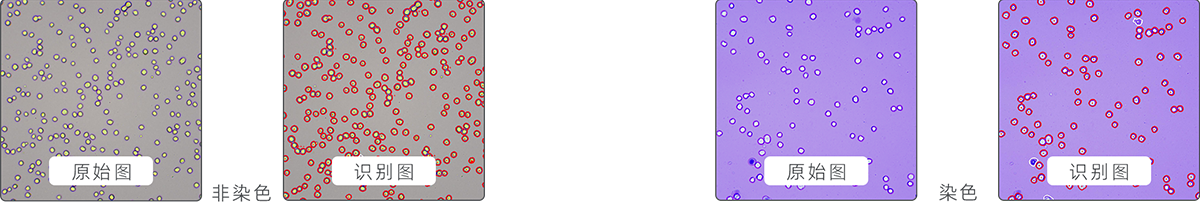 非染色計(jì)數(shù)(發(fā)明專利號:ZL 201310101403.0):無需染色,直接對細(xì)胞進(jìn)行計(jì)數(shù)和區(qū)分活死細(xì)胞,適用于狀態(tài)良好、背景干凈的培養(yǎng)細(xì)胞;臺盼藍(lán)染色計(jì)數(shù):區(qū)分活細(xì)胞和死細(xì)胞的經(jīng)典方法,相比非染色法,色彩變化更直觀。