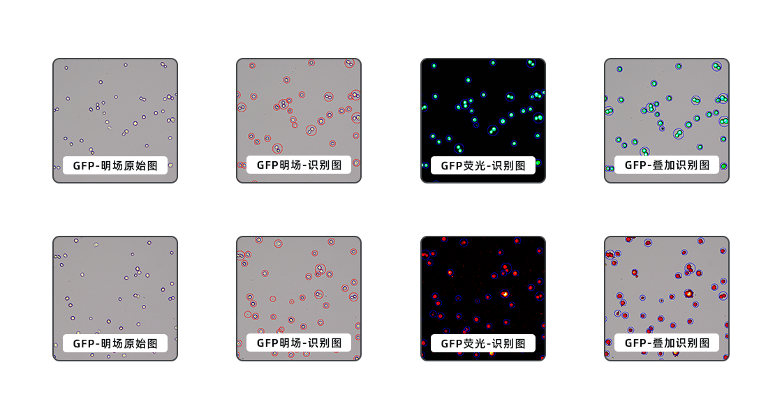 博大博聚熒光細胞計數、分析儀均配置了“轉染實驗”模式,設計用于處理熒光標記的細胞,如“綠色熒光蛋白GFP”和“紅色熒光蛋白RFP”(其他熒光蛋白類型的分析模式可按需定制)。儀器配備智能分析功能,可以自動計數和分析熒光標記的細胞,減少人為誤差。
